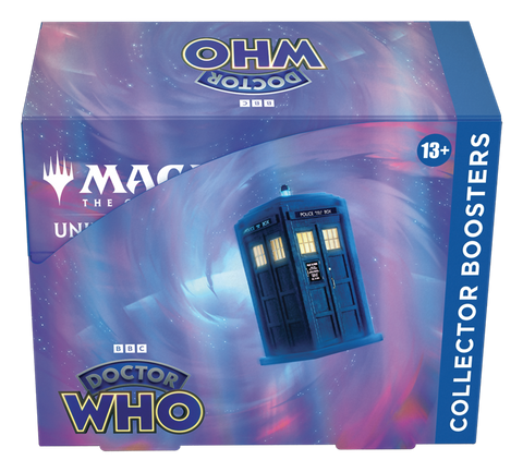 The Universes Beyond: Doctor Who™ Collector Booster Box contains 12 Universes Beyond: Doctor Who™ Collector Boosters. Each Collector Booster contains 15 Magic: The Gathering cards and 1 Traditional Foil double-sided token, with a combination of 7-14 cards of rarity Rare or higher and up to 7 Uncommon, 5 Common, and 1 Land cards. Every pack contains a total of 12 Foil cards.